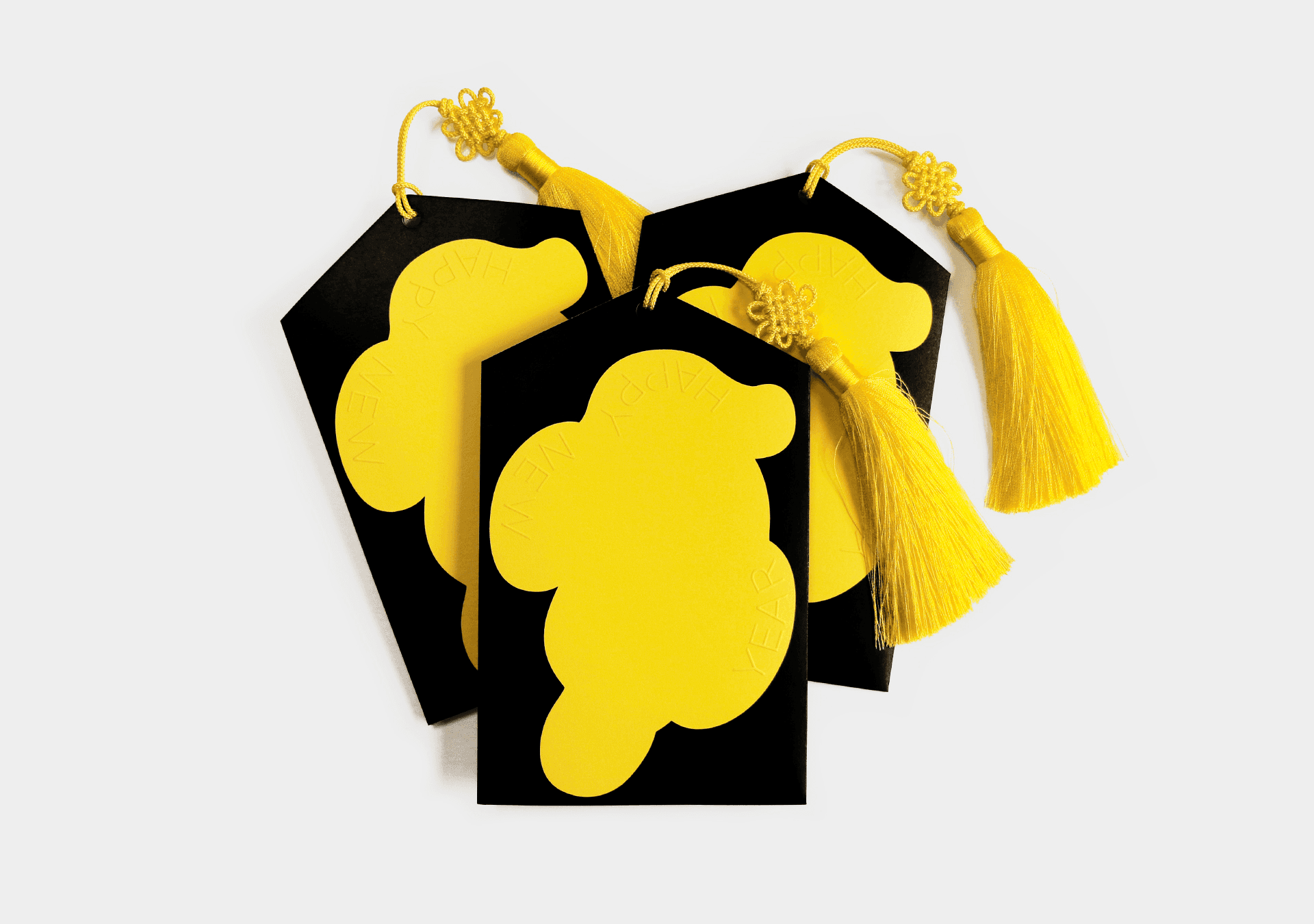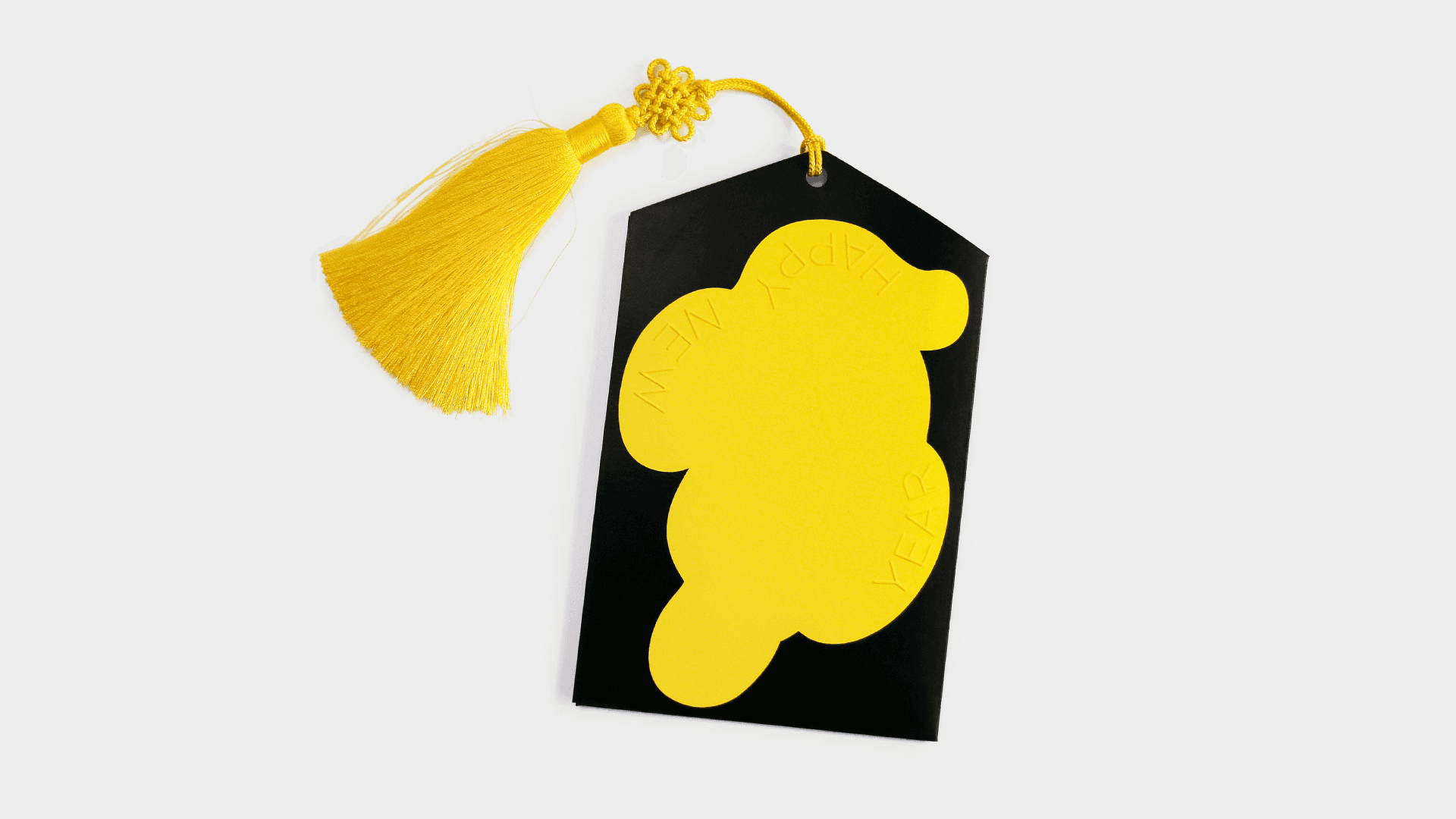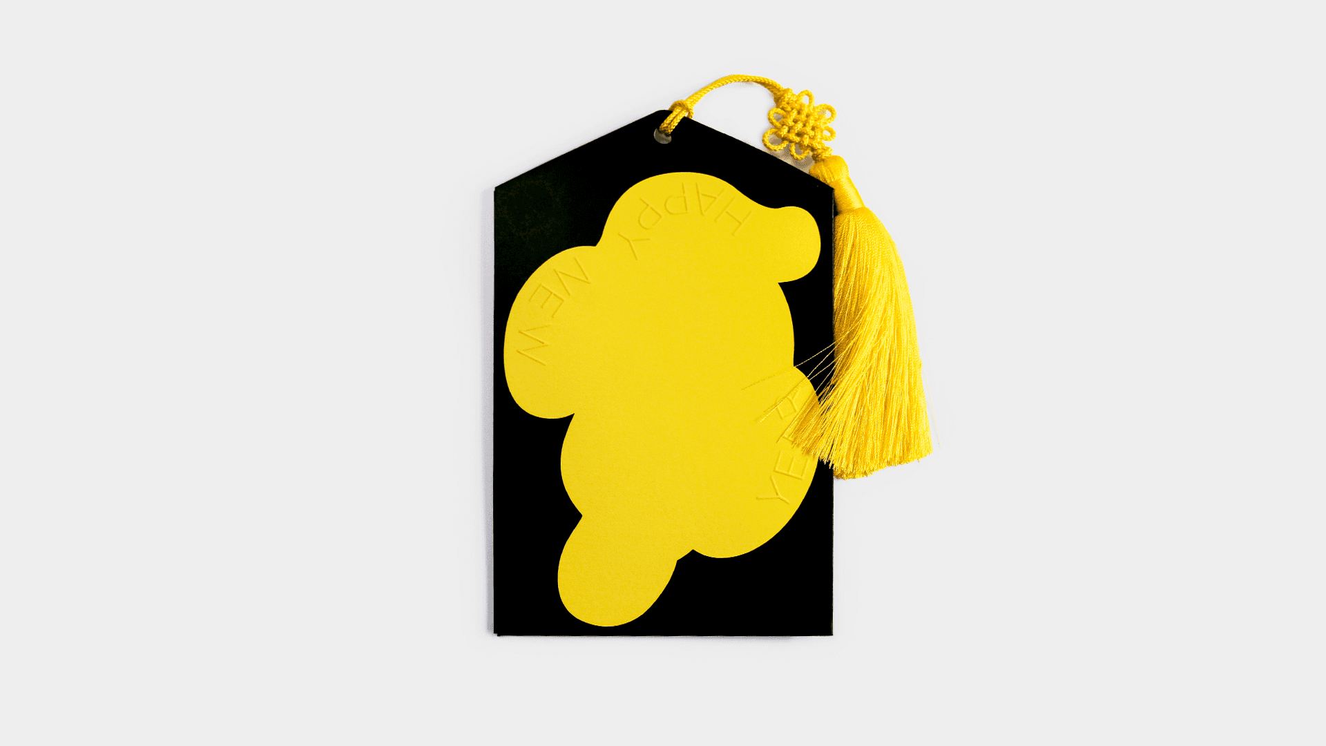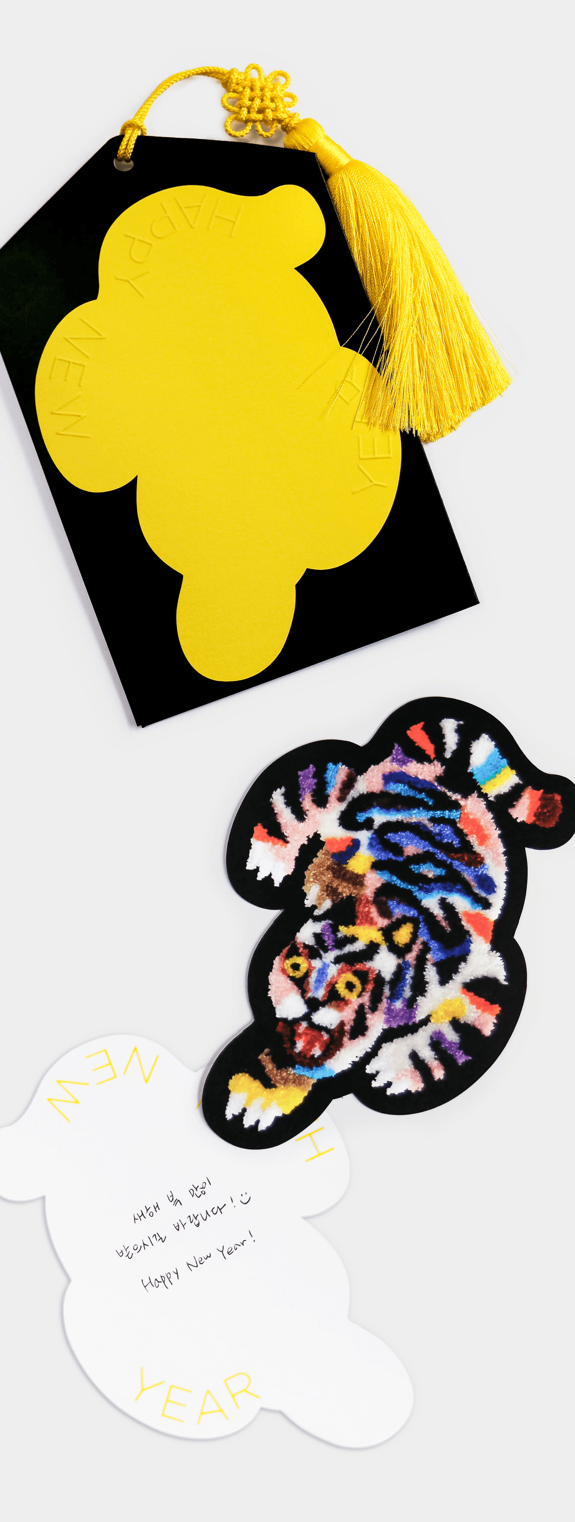 The card is housed in an envelope inspired by traditional Korean lucky charm pouches and finished with a norigae tassel. Familiar symbols are reinterpreted through handcrafted texture and playful construction, balancing reverence with a contemporary sensibility.