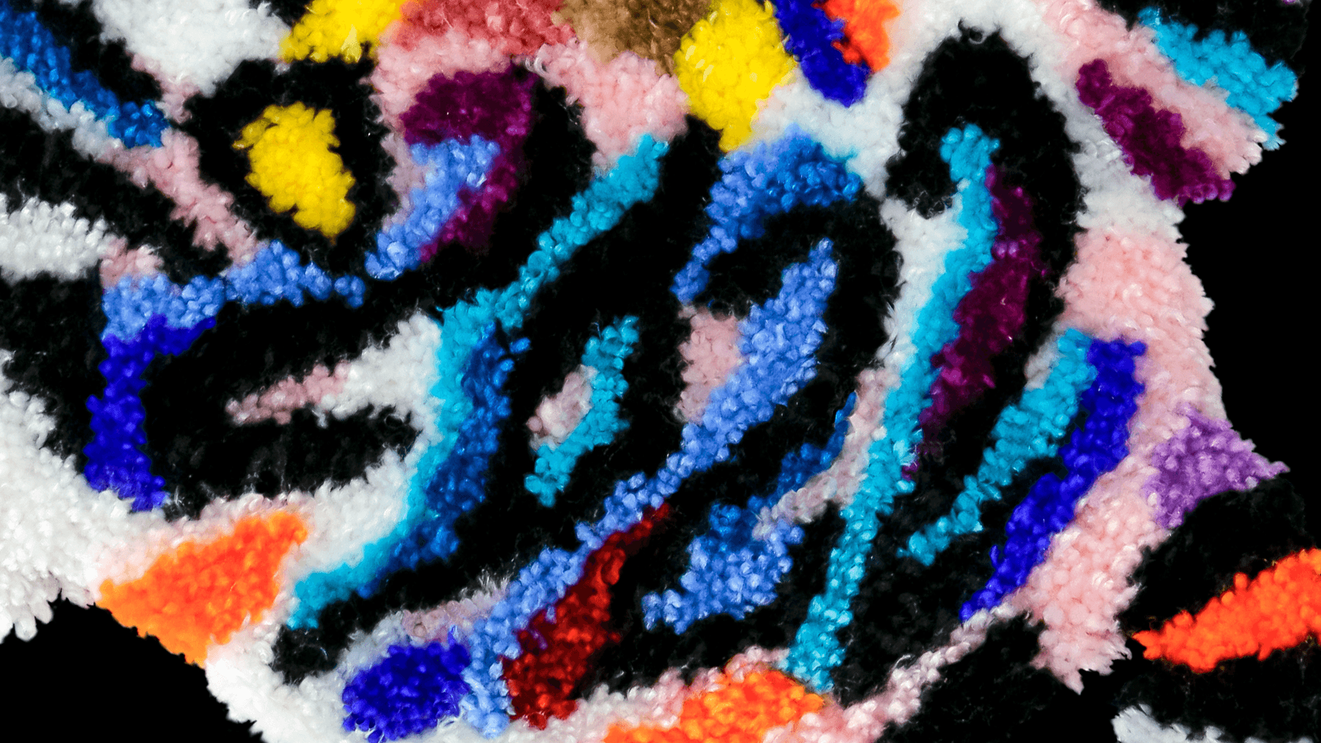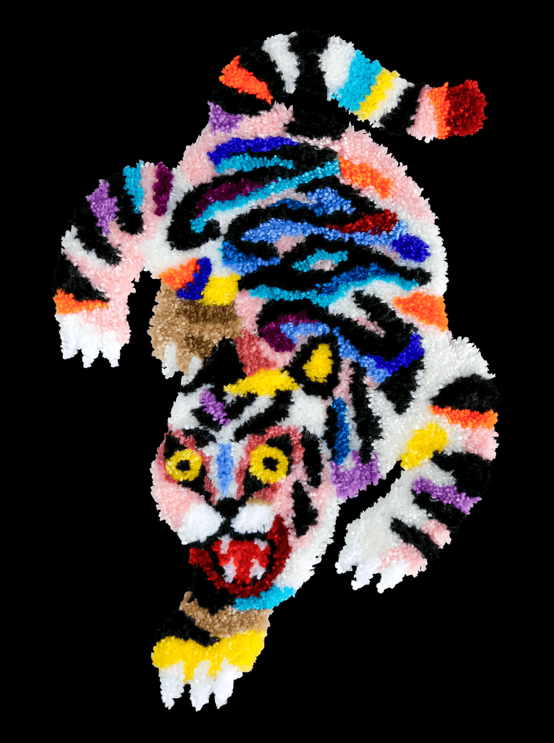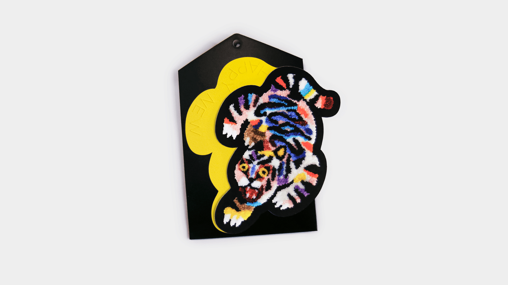 A New Year greeting becomes an exploration of texture, form, and cultural memory. Created to mark the Year of the Tiger(2022), the piece pairs a tactile card with a small rug, using latch hook techniques to build soft, dimensional letterforms. The tiger’s form draws inspiration from Korean folk painting, lending a playful yet symbolic presence, while the numerals rest across its back so that material and typography merge into a single tactile surface.