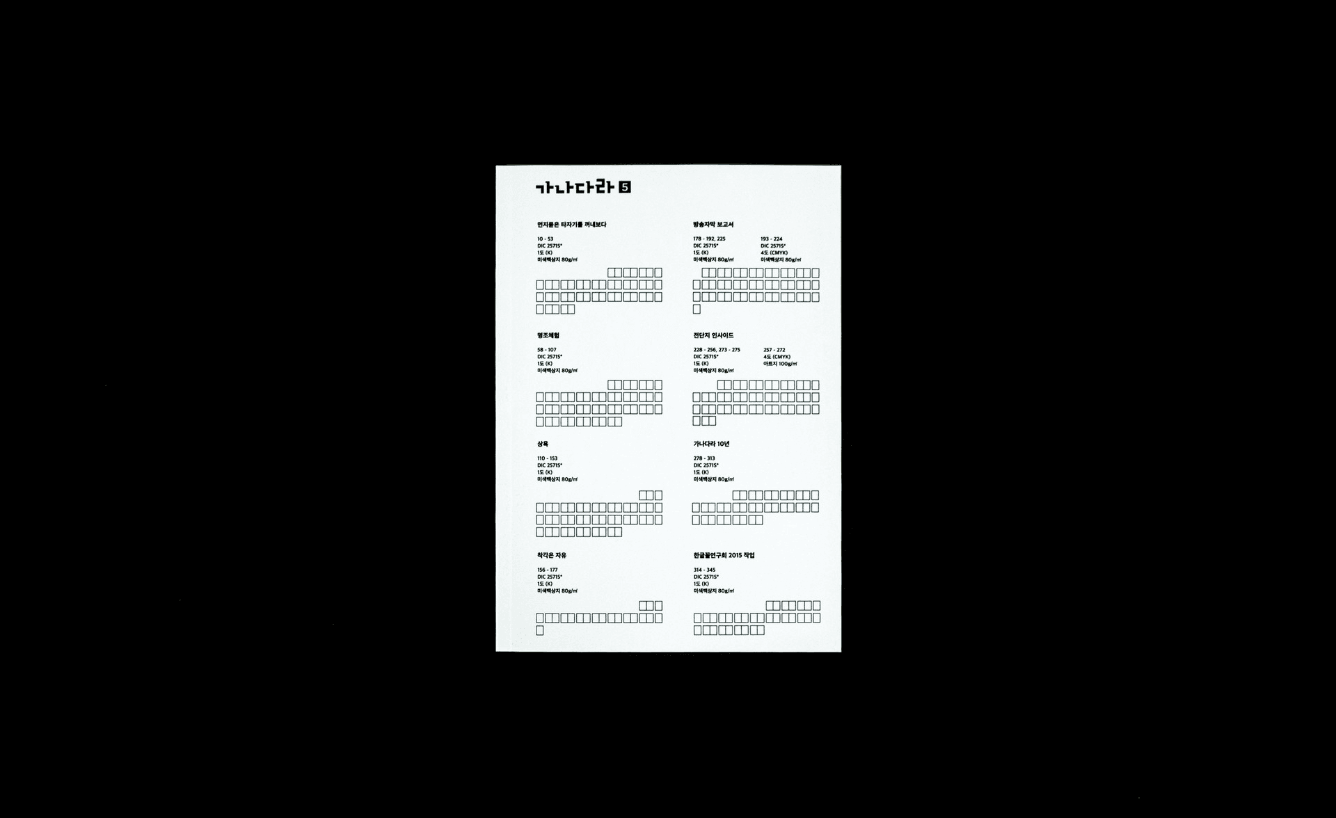 Ganadara Vol.5 was published by Hangulggol Study Group, a typography collective based in Hongik University devoted to the study and celebration of Korean letterforms. Produced as both a book and exhibition, the volume examined the overlooked typographic landscape of everyday flyers and street notices.