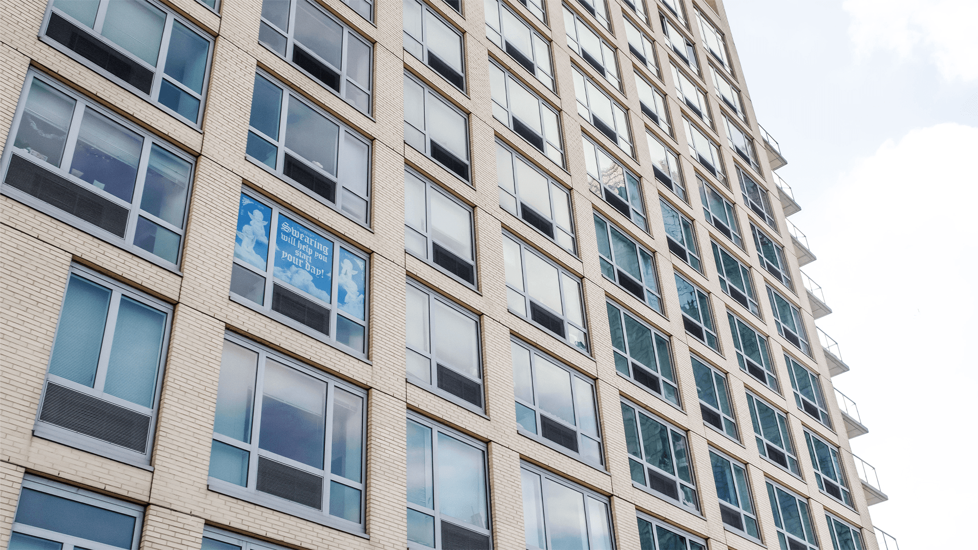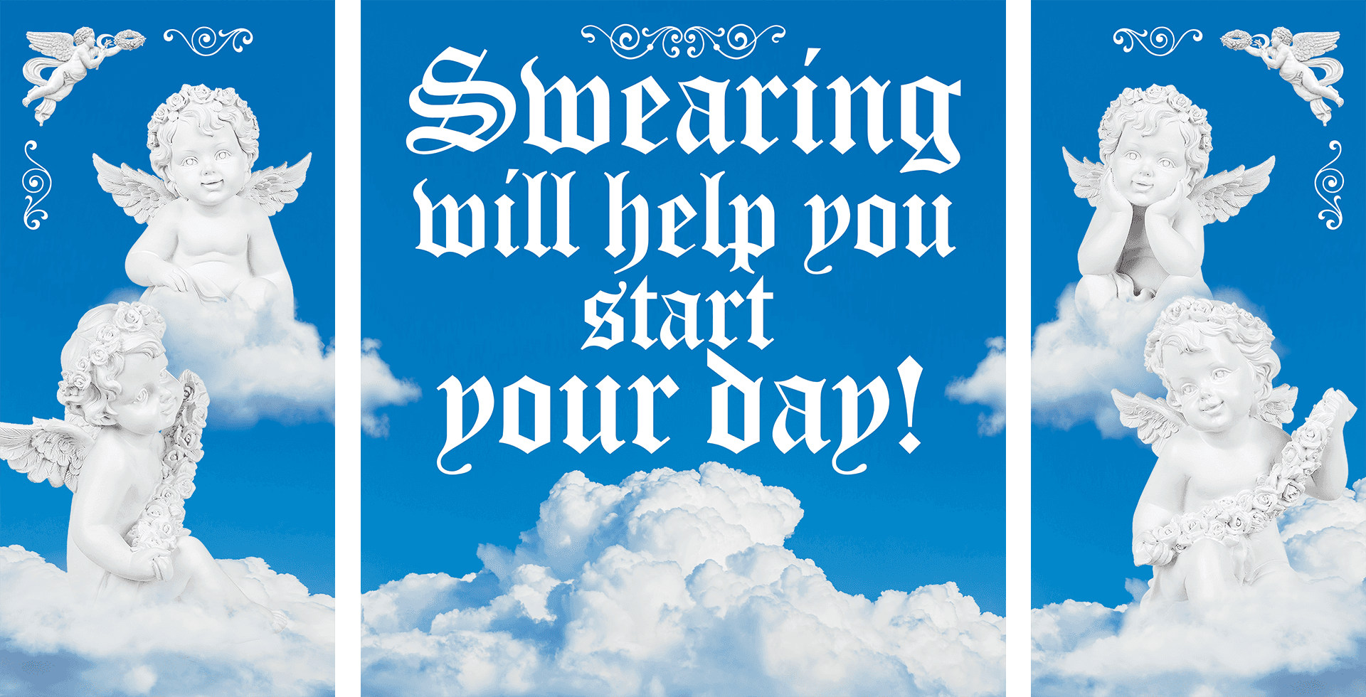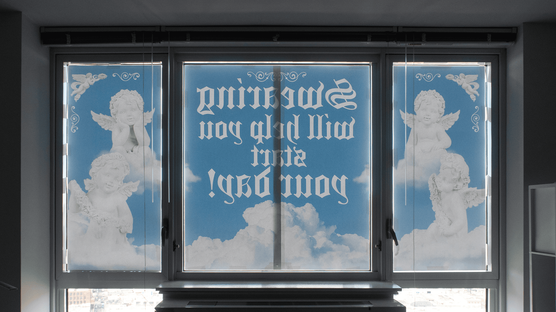 Displayed across a window-facing poster, the message extends beyond the private interior to meet passersby in the shared rhythm of morning routines. A luminous sky and an innocent angel form the central image, creating a gentle visual paradox that tempers the provocation of the words. The contrast between purity and profanity invites a smile, transforming a small daily struggle into a moment of levity and connection.