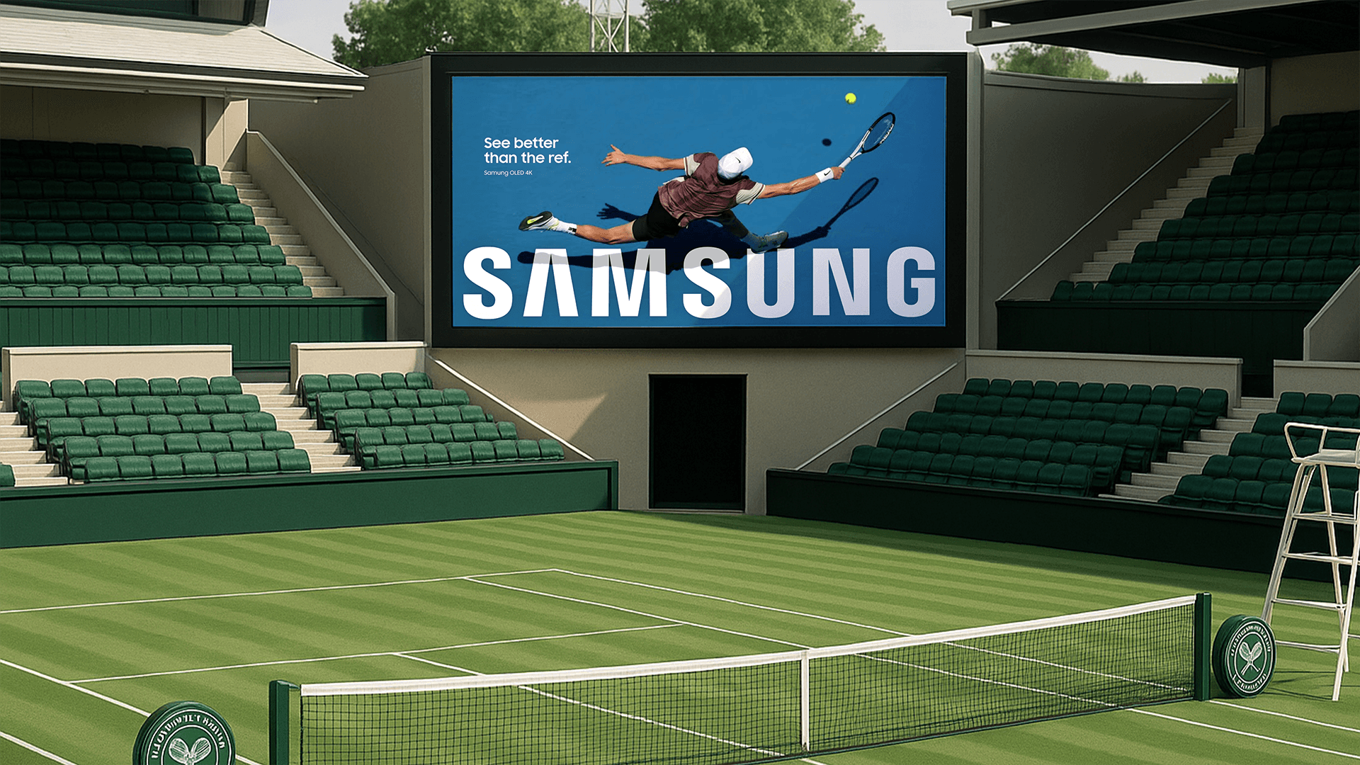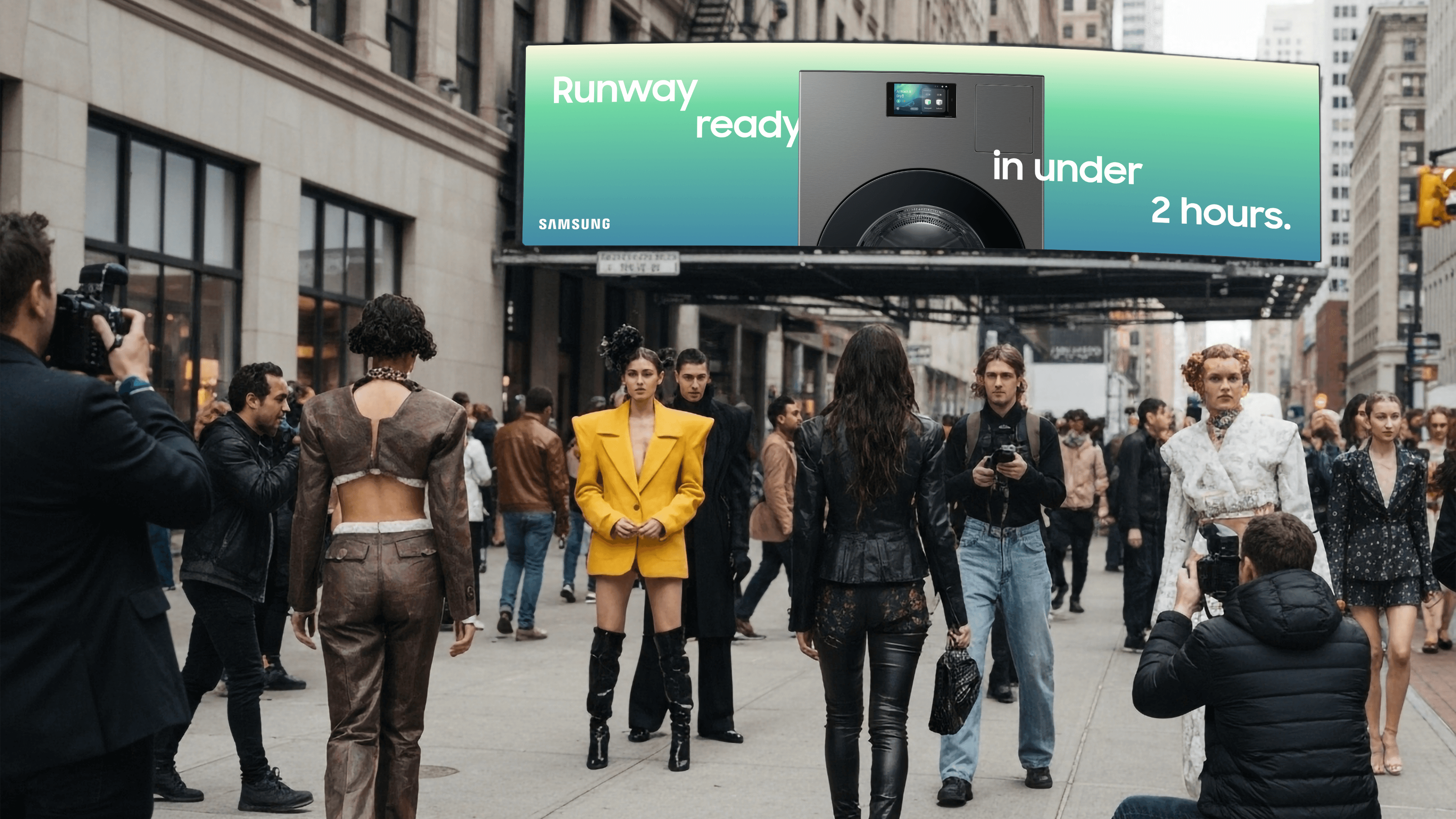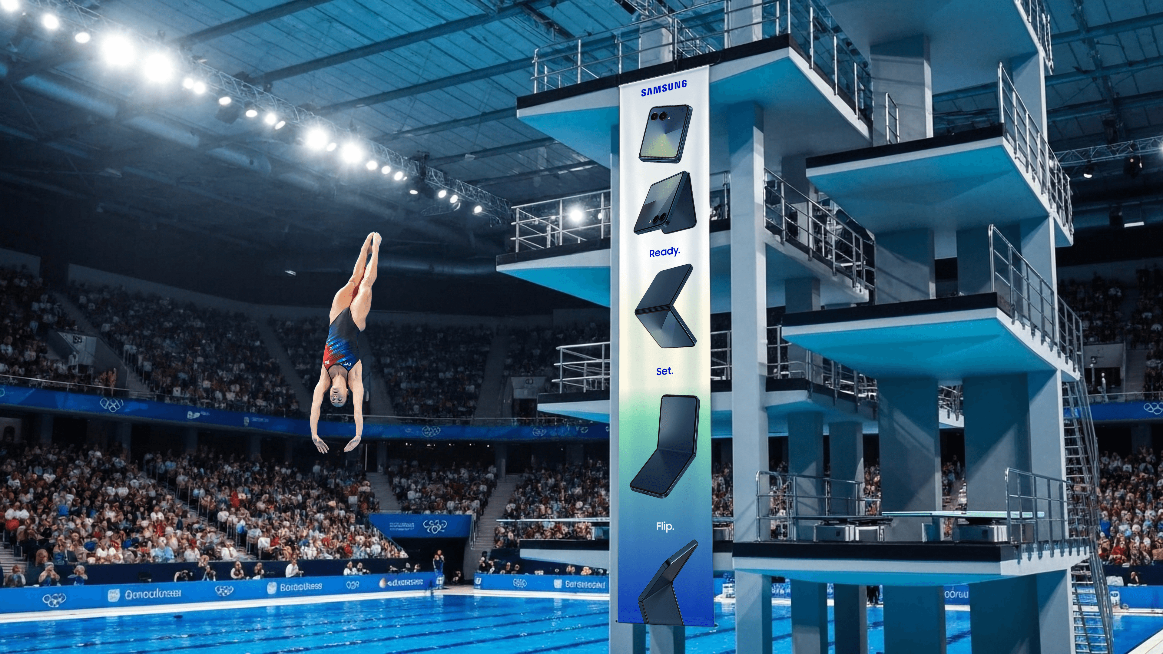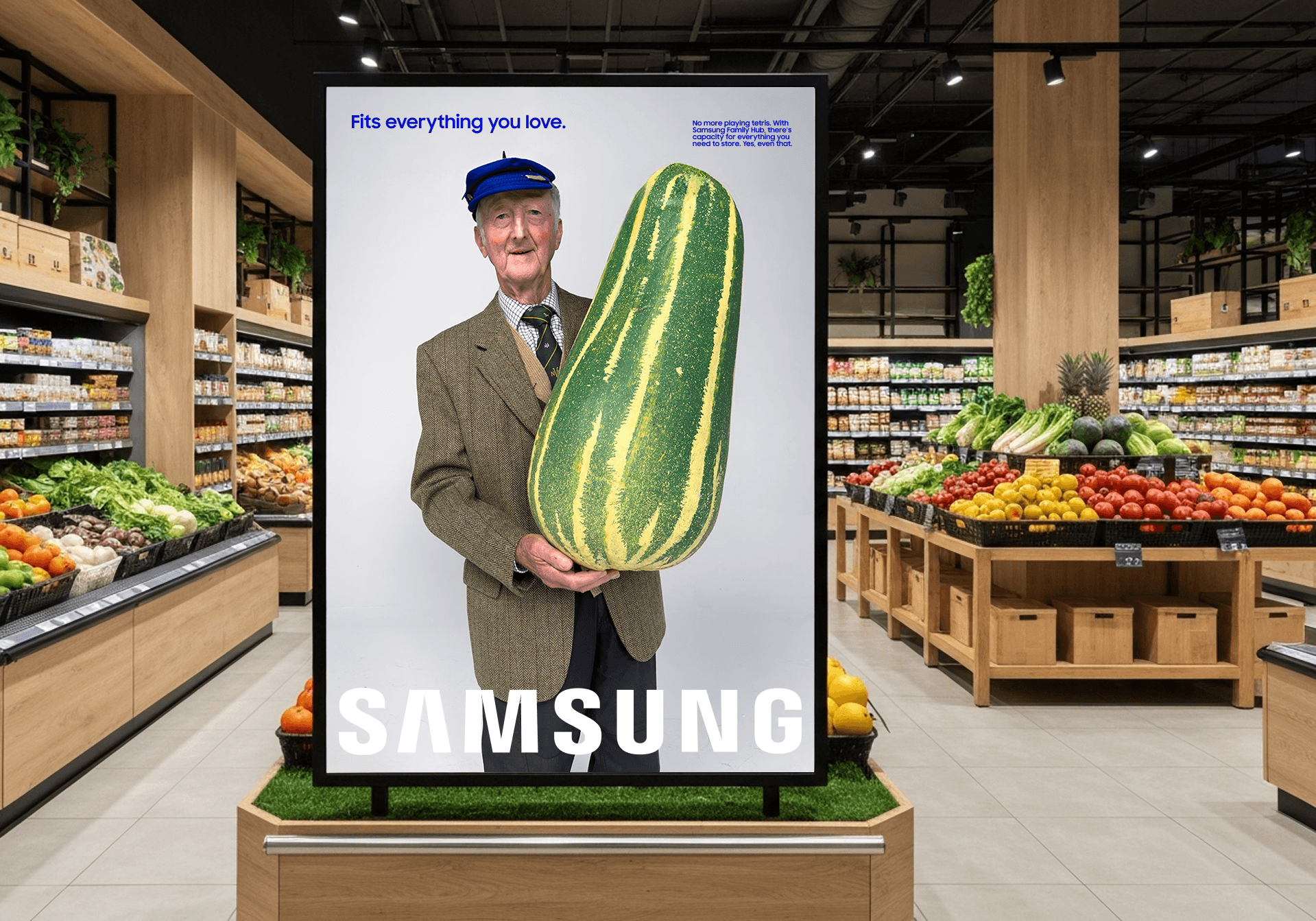 The wit only deepens with context. A Galaxy Flip ad installed beside a diving pool, its folding form mirroring the athlete's tuck. A refrigerator campaign that never shows the product, only a man proudly holding a zucchini the size of a small child. The more you notice, the more deliberate it feels.